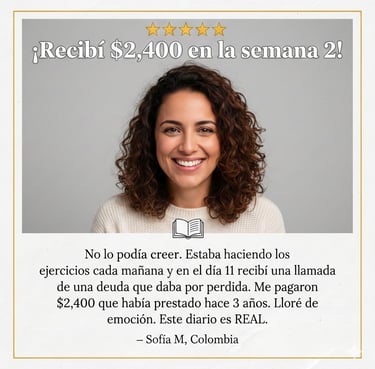 El único diario guiado diseñado específicamente para manifestar abundancia real en 30 días a través de ejercicios de escritura cósmica, reprogramación subconsciente y alineación energética.